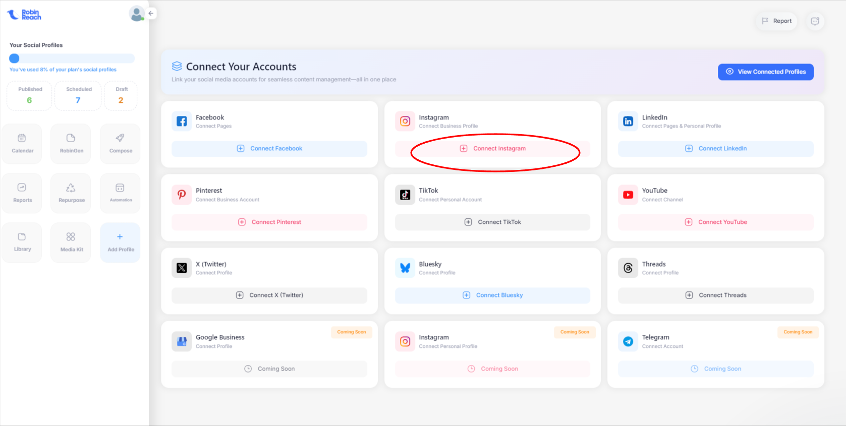 Easily connect your Instagram account to RobinReach to start managing your profiles and pages. Follow these steps: