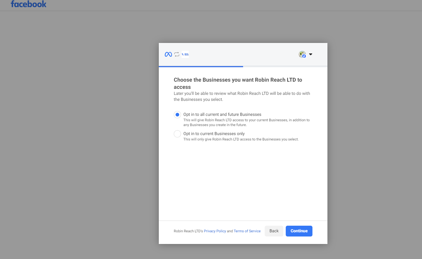 Step 4: Choose the Pages and Businesses you want to add to RobinReach and click Continue.