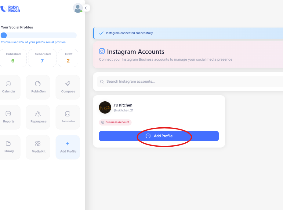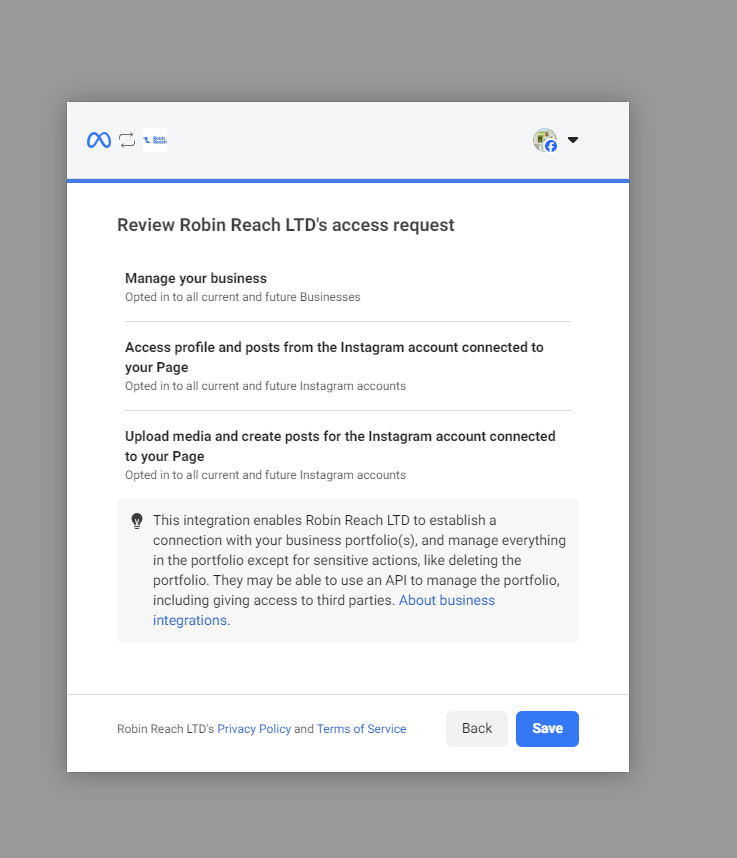 Your Instagram account and selected pages are now linked to RobinReach. You can start managing your social media effortlessly! If you encounter any issues, check our Support Articles or contact support