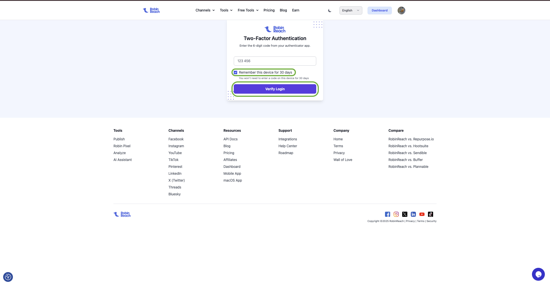 Two-Factor Authentication (2FA), also known as Multi-Factor Authentication (MFA), adds an extra layer of security to your RobinReach account. In addition to your password, you will need to enter a 6-digit code from your mobile device to log in.