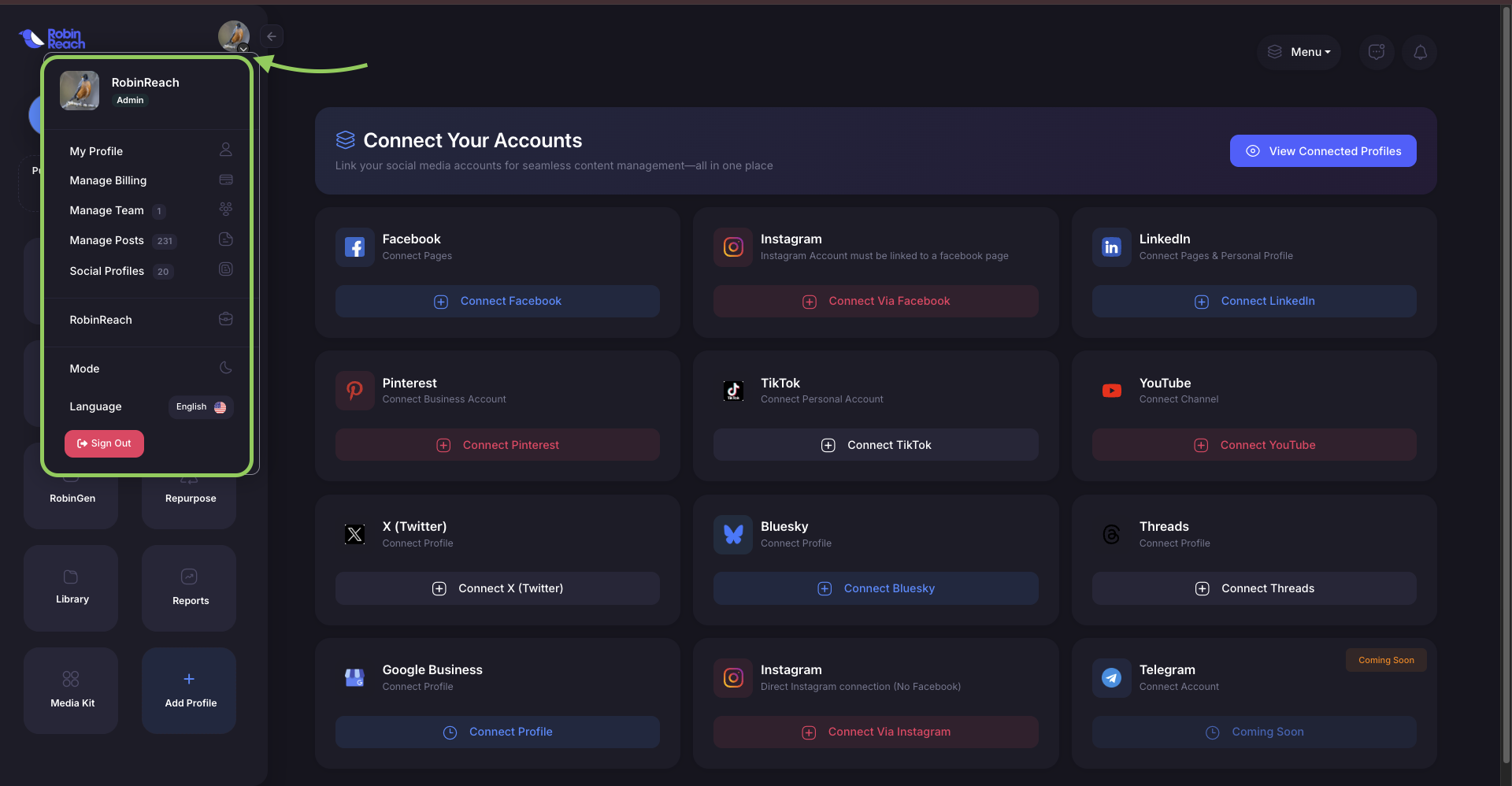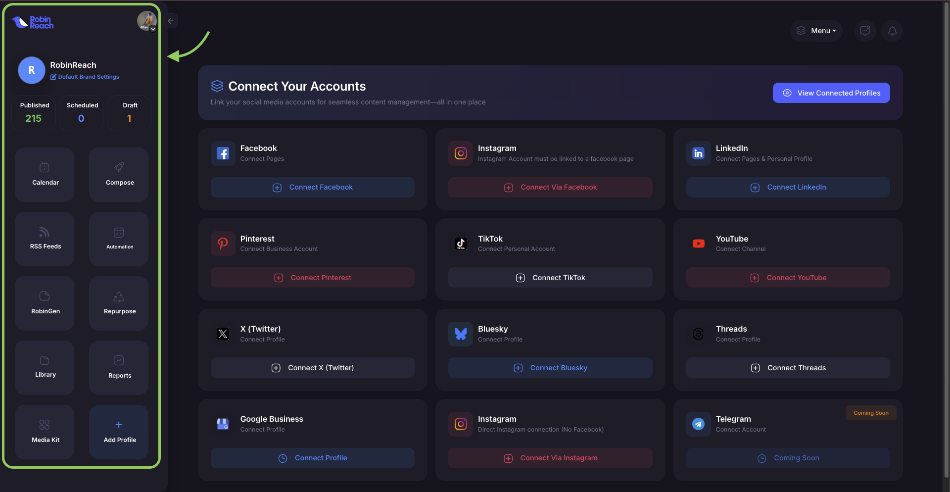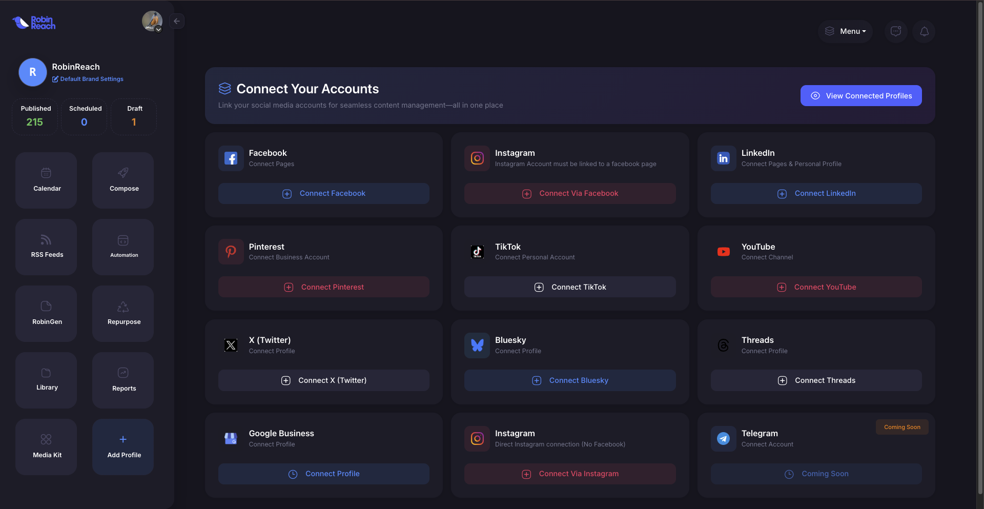 The RobinReach Dashboard is designed to be your central command center for all social media management activities, providing intuitive access to powerful tools and features that help you create, manage, and optimize your social media presence effectively.