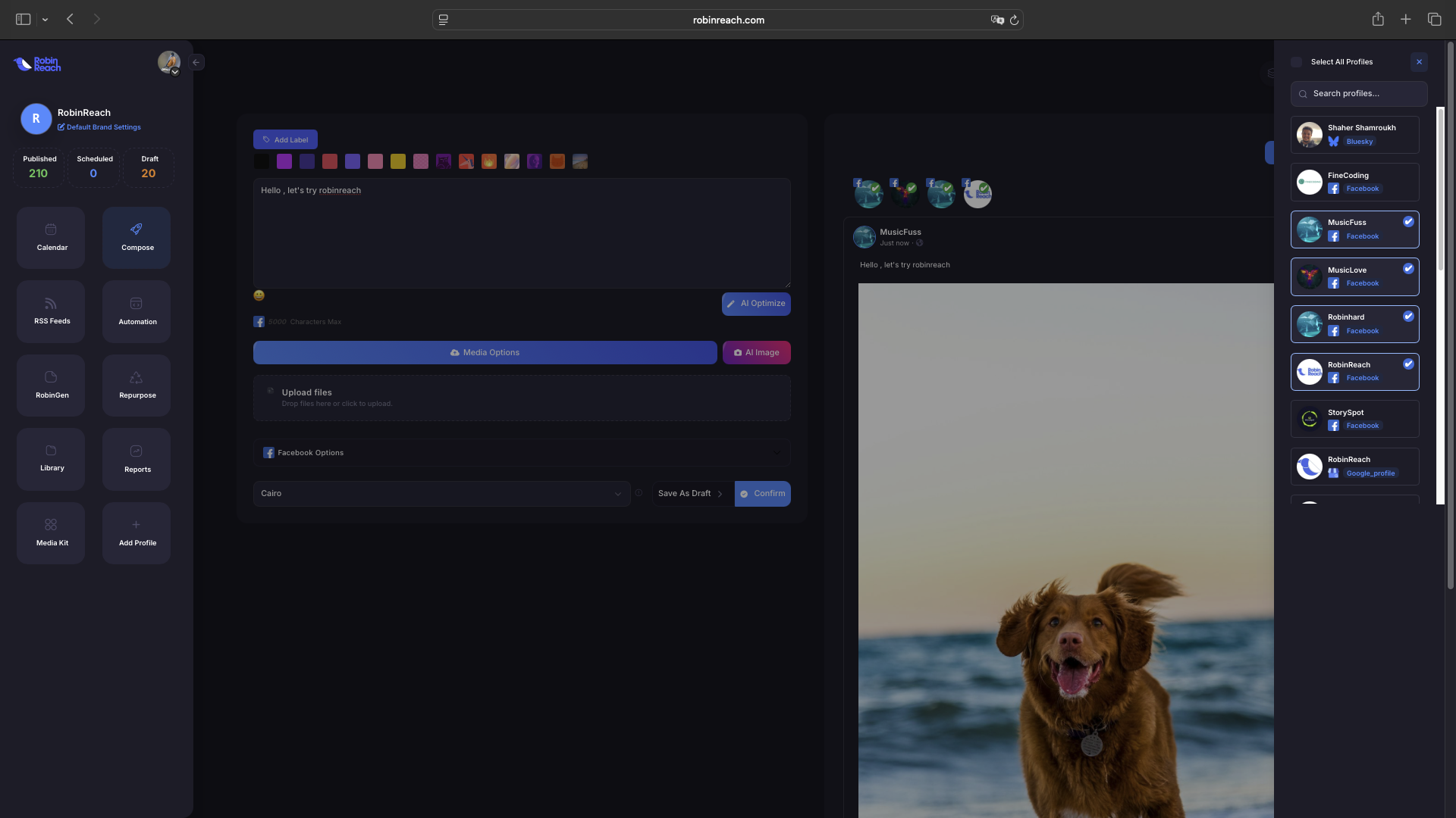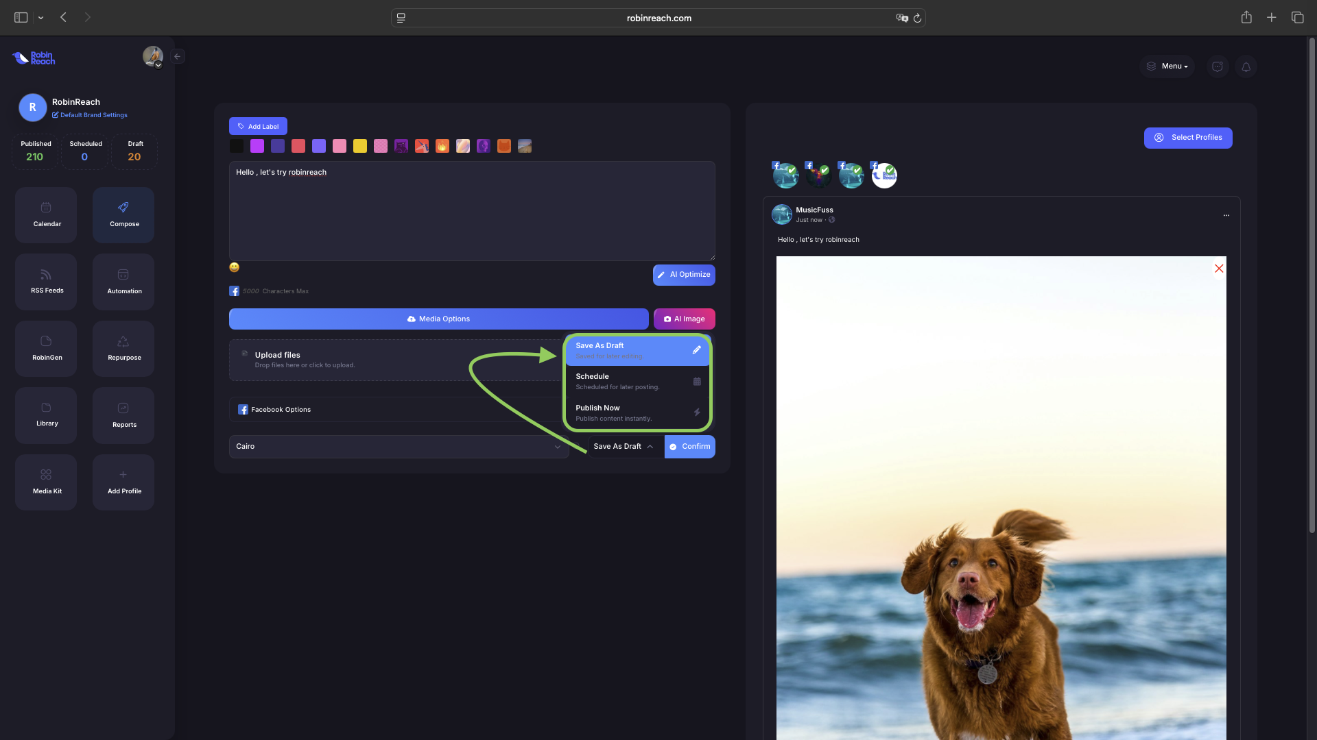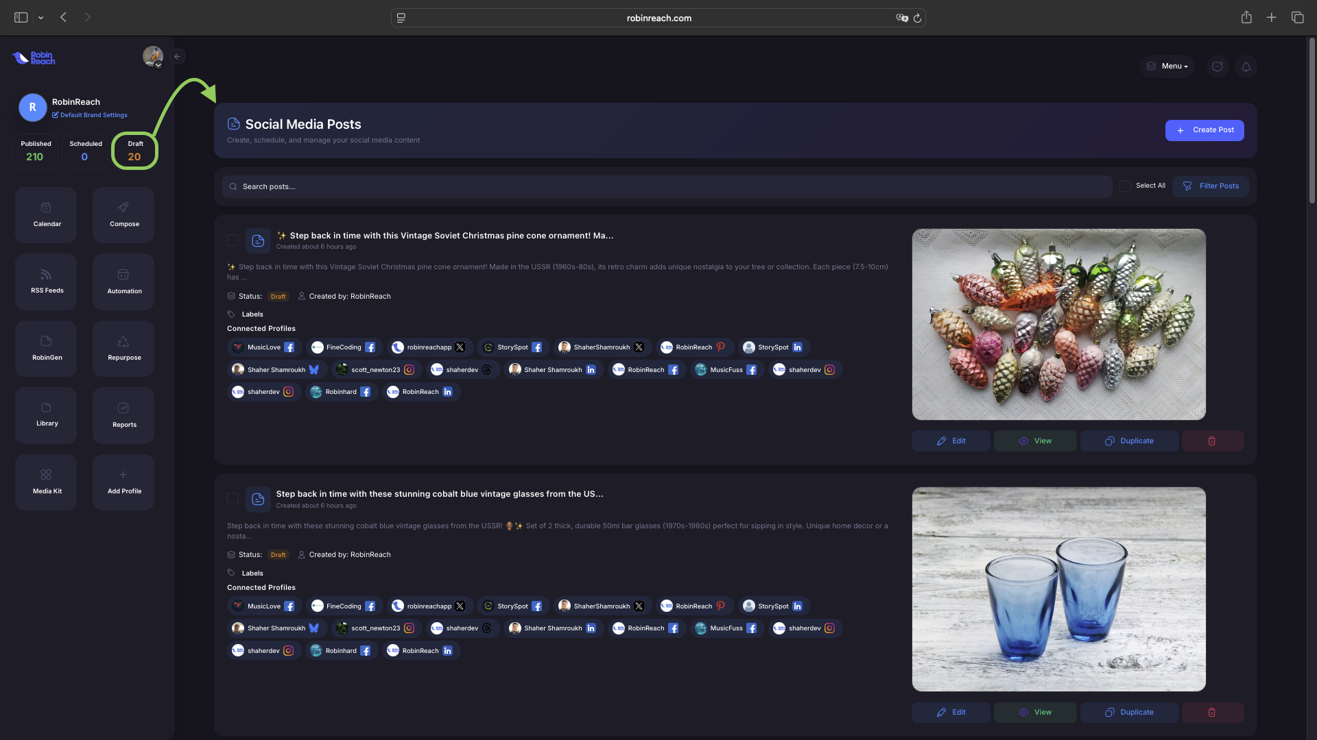 With RobinReach's comprehensive draft system, you have the flexibility and tools needed to create, refine, and perfect your social media content before it goes live. Use drafts to maintain quality control, collaborate with your team, and build a consistent content strategy across all your social media platforms.