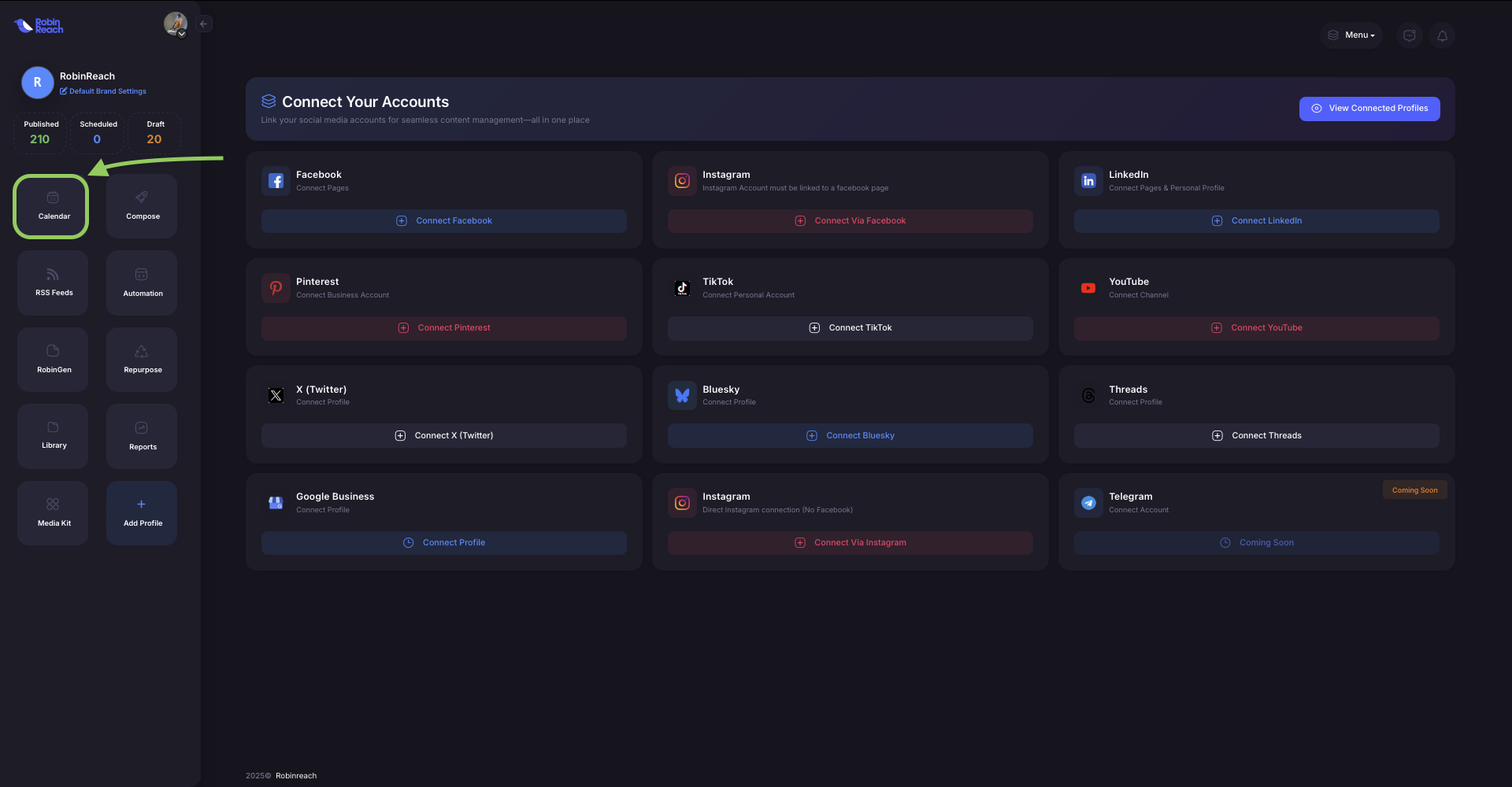 RobinReach's calendar feature offers an organized and efficient way to manage your social media posts with advanced filtering, drag-and-drop functionality, and comprehensive content scheduling capabilities. Here's how to make the most of this powerful tool.