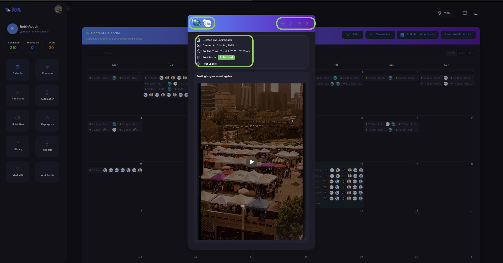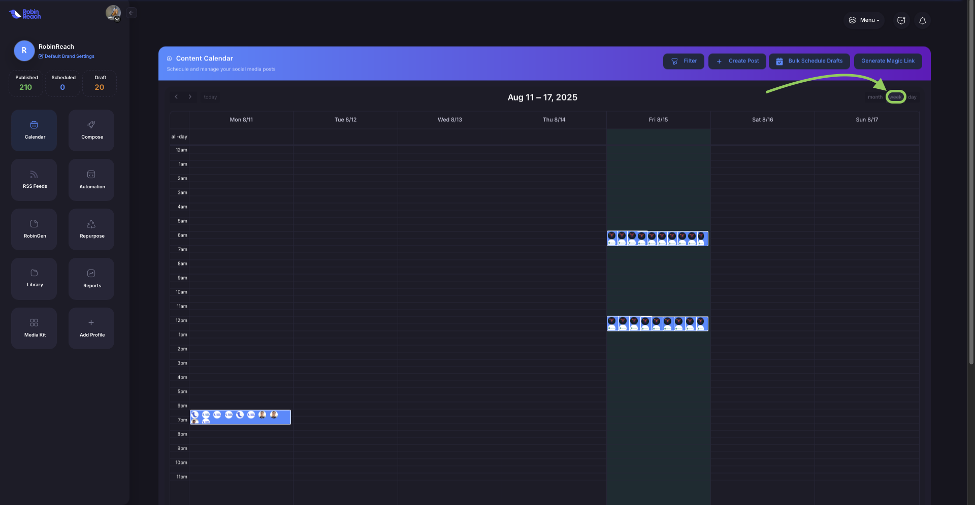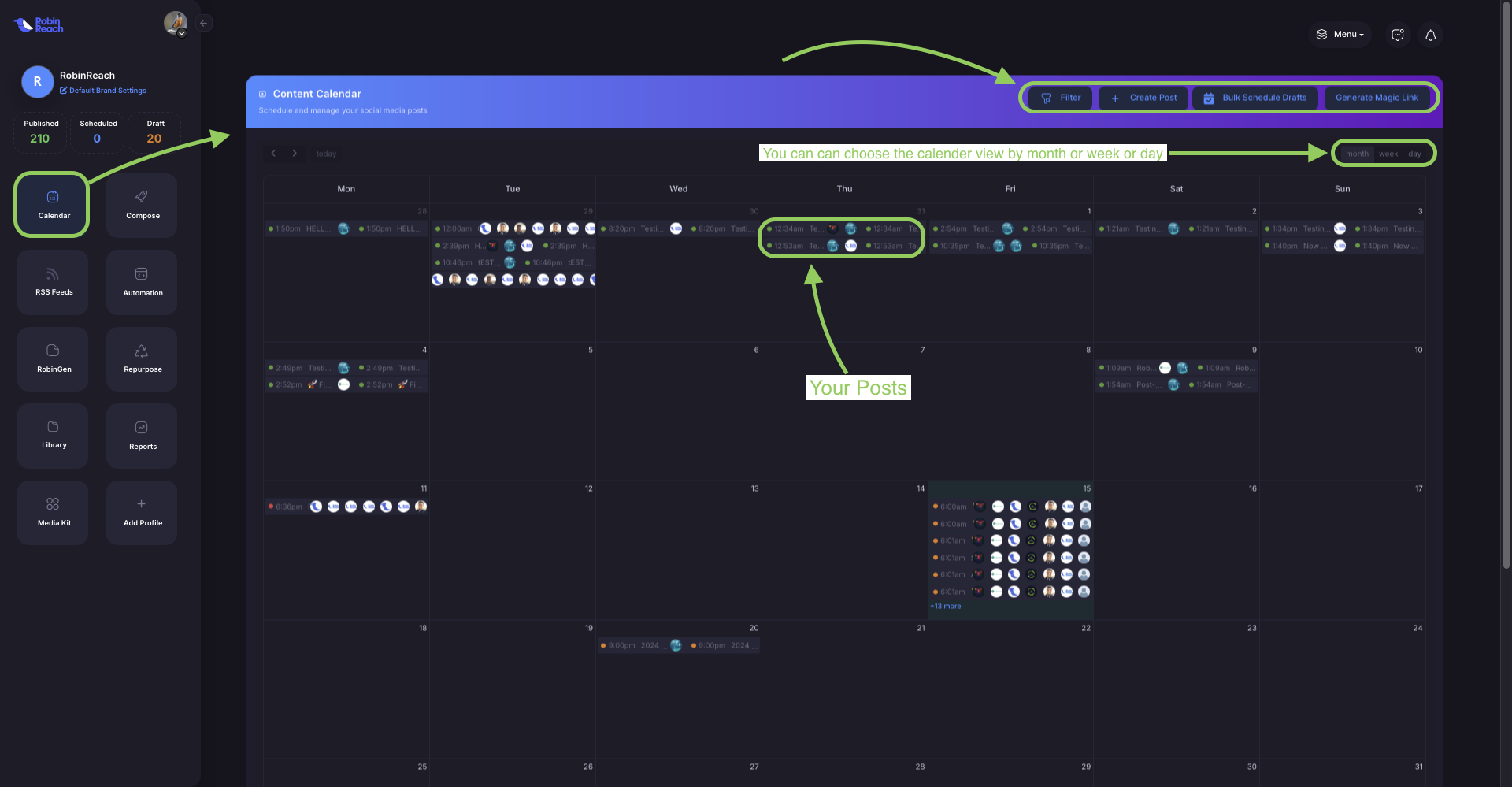 With RobinReach's calendar, managing your social media schedule has never been more efficient. Stay organized, maintain consistent posting across all platforms, and leverage powerful tools to optimize your content strategy.