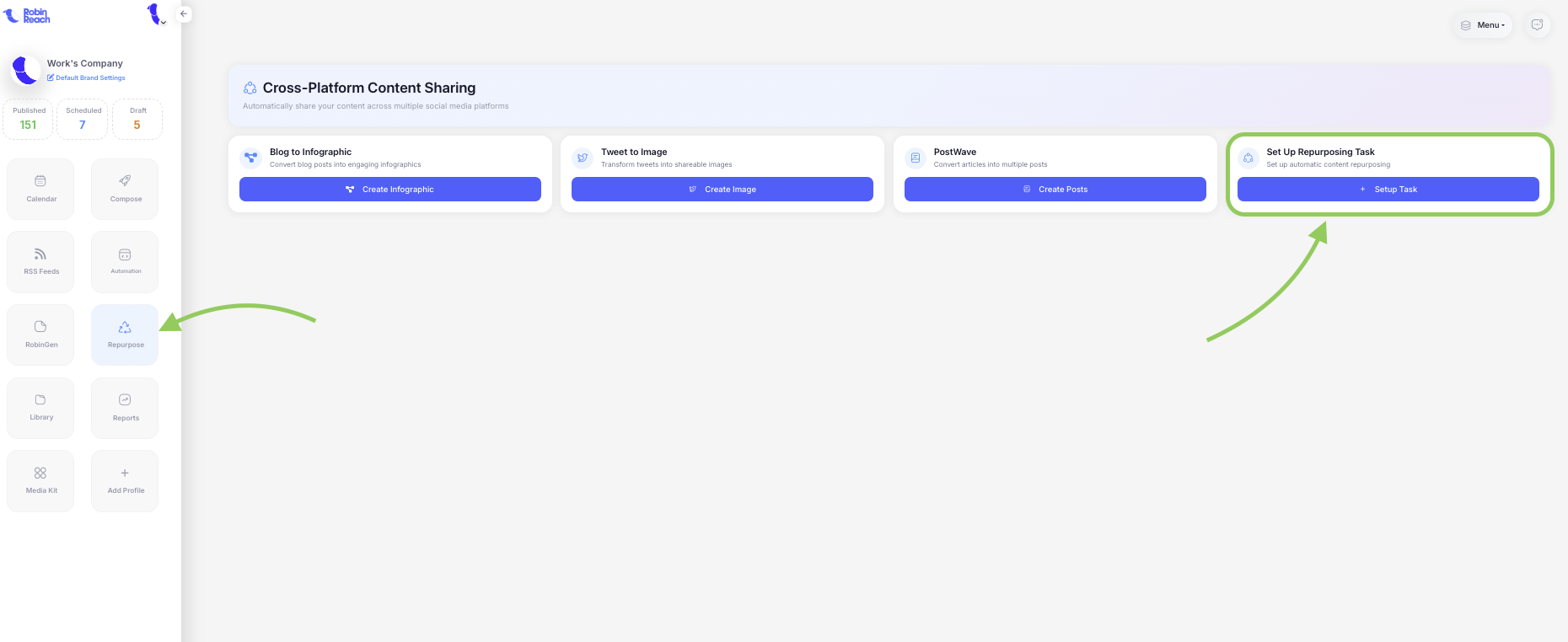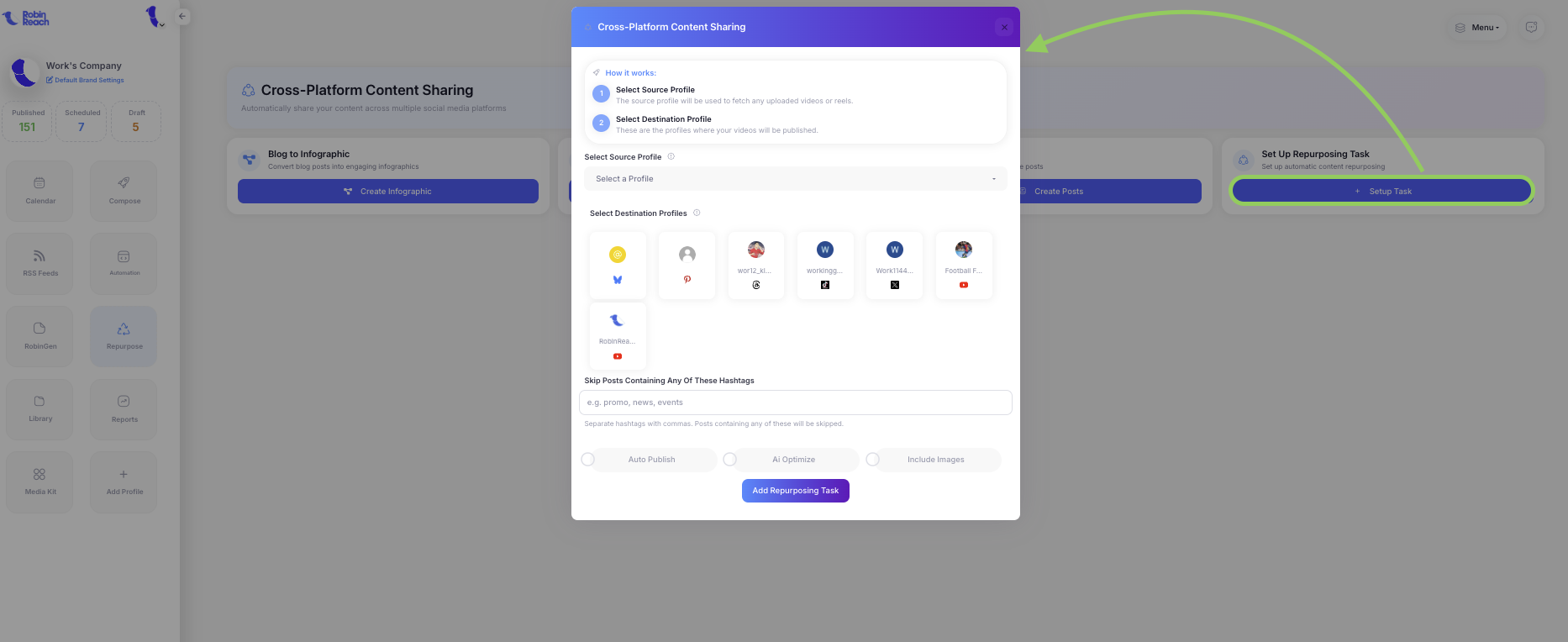 RobinReach's Repurposing Task feature lets you automate cross-platform content sharing, ensuring your videos, reels, and images reach a wider audience across multiple social media platforms. Follow these steps to set up your automated content repurposing workflow.