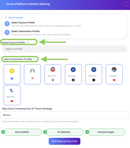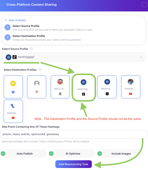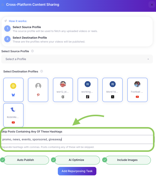 - Filter Configuration: Specify hashtags to skip during repurposing