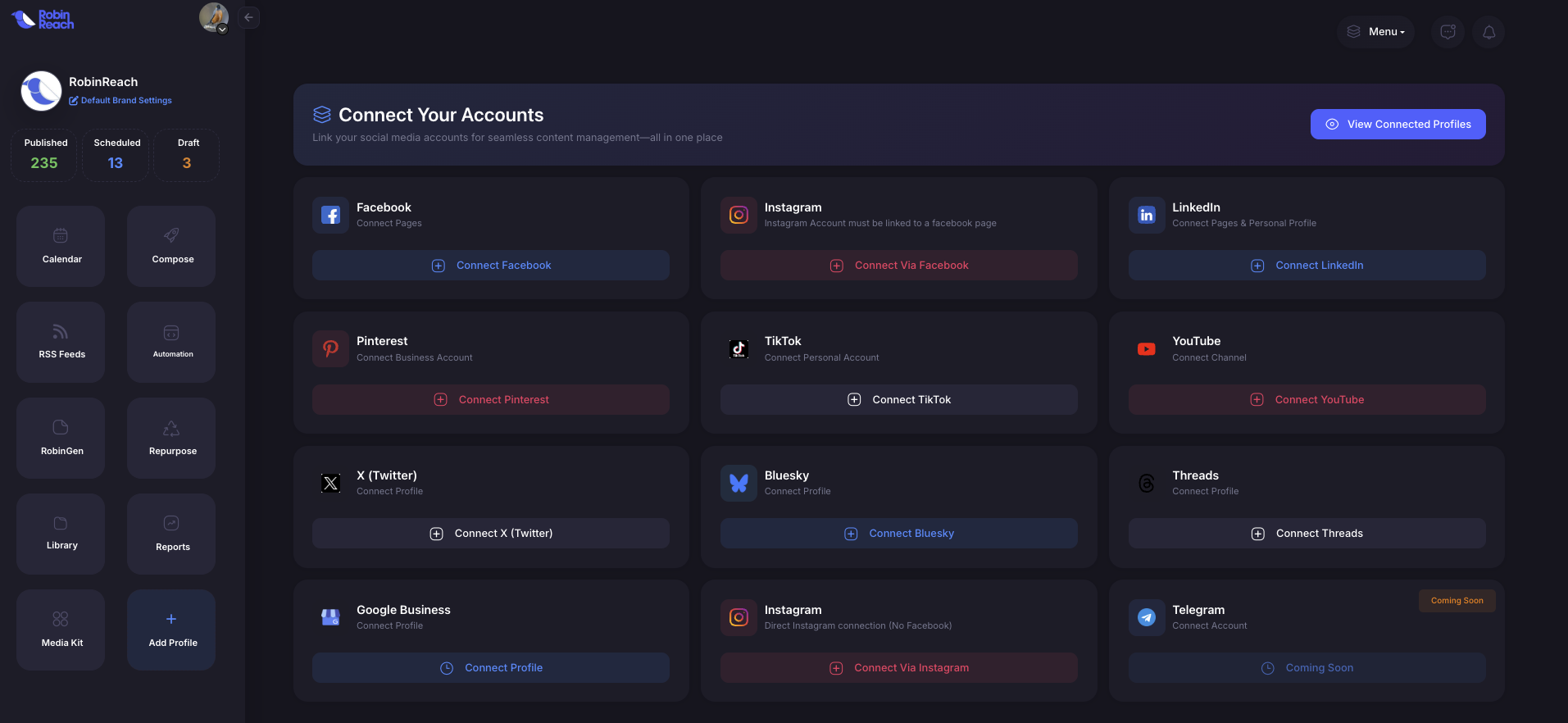 RobinReach supports 11 major social media platforms: