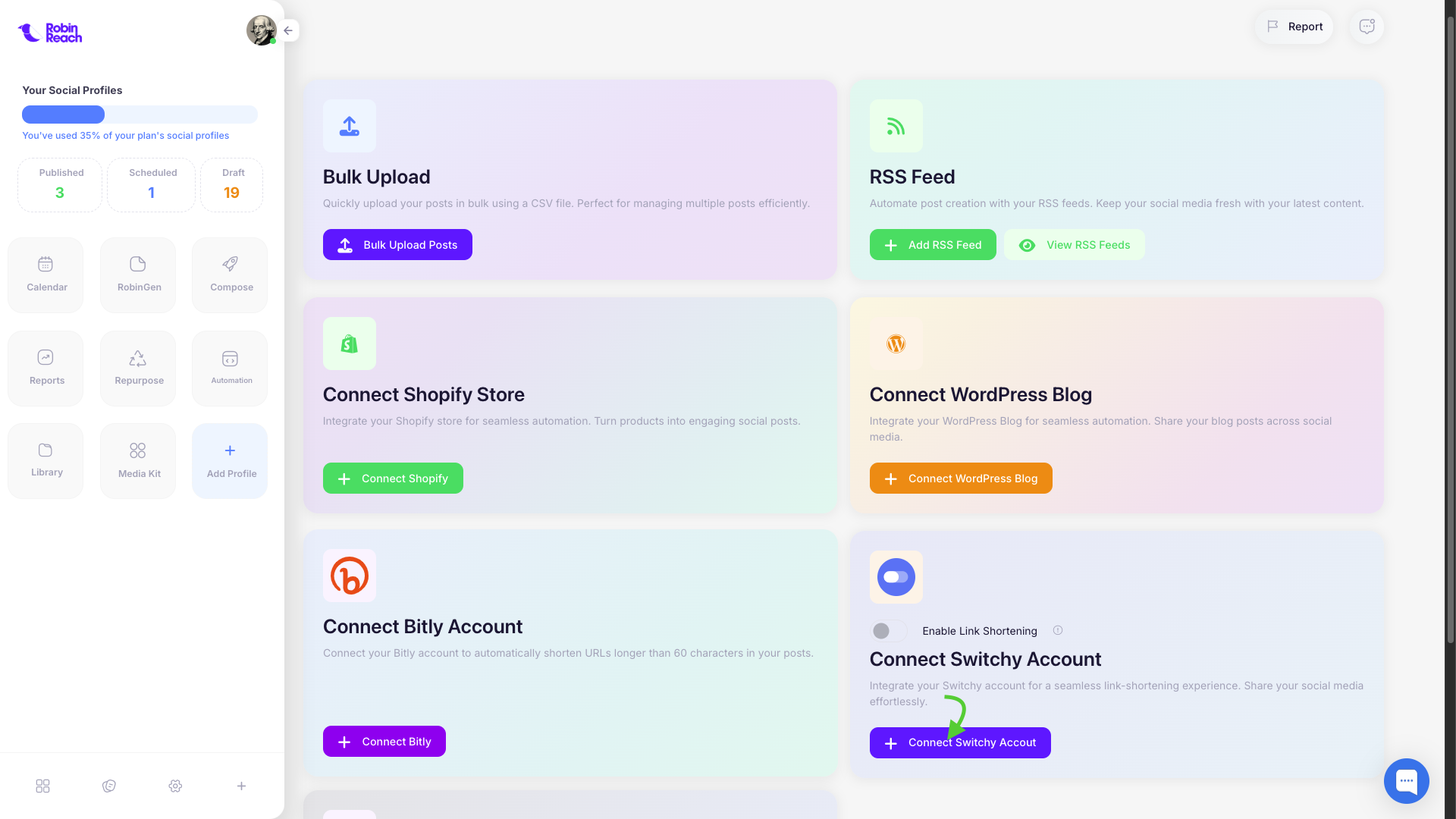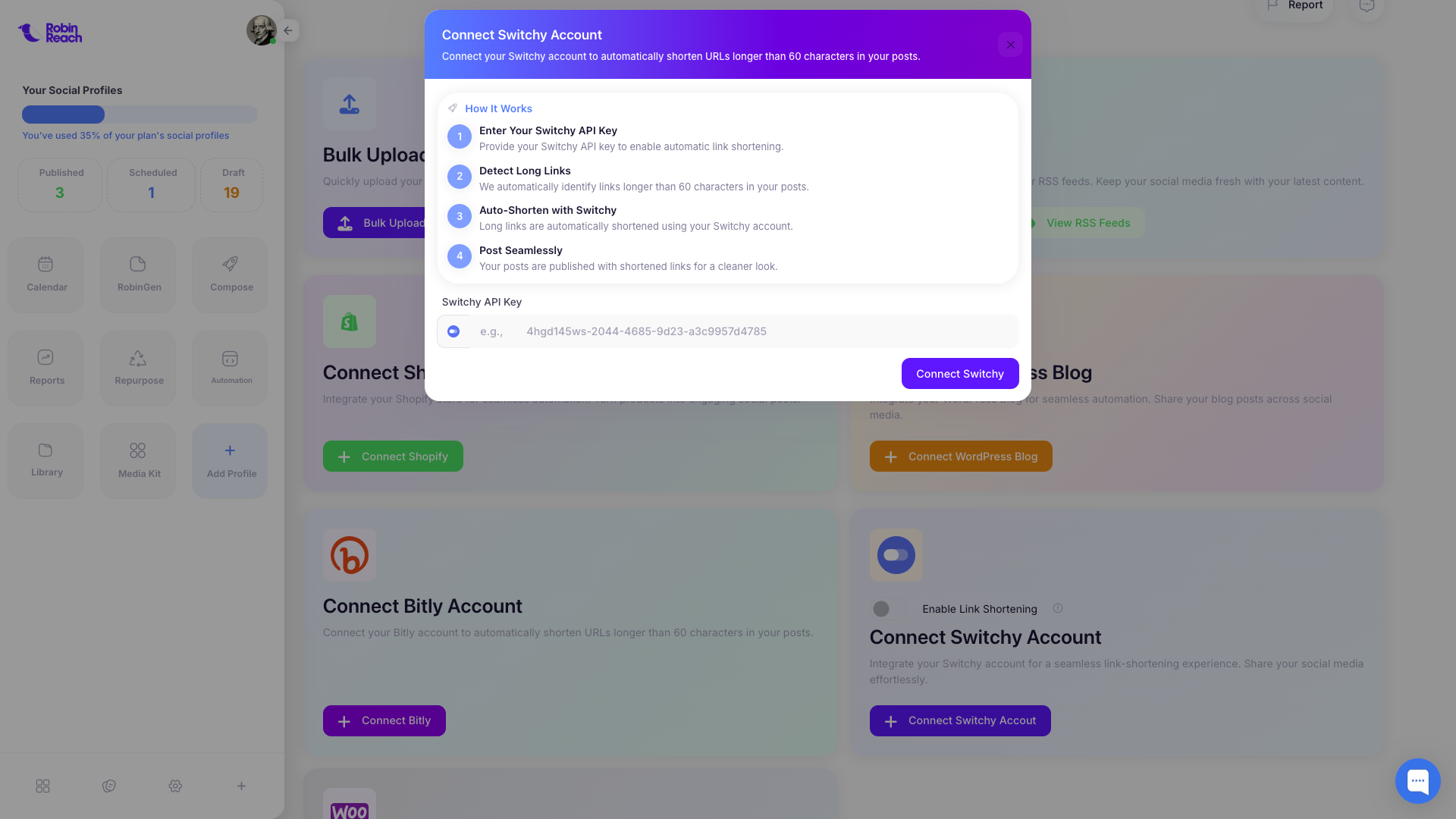 RobinReach’s Switchy Integration helps you keep your social media posts clean, trackable, and optimized by automatically shortening long URLs.