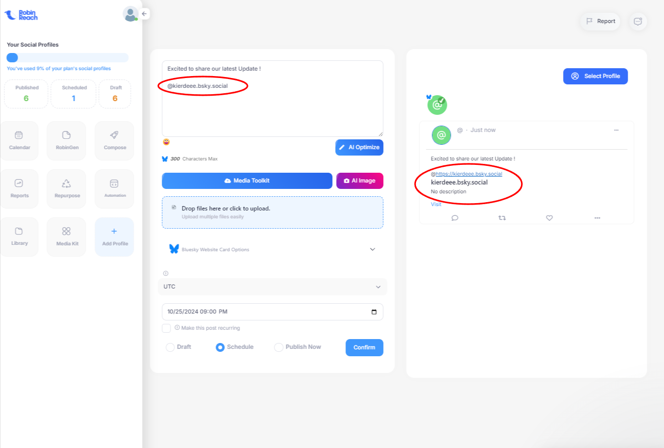 - Tag other users by inputting their full handle, e.g., @name.bsky.social.
